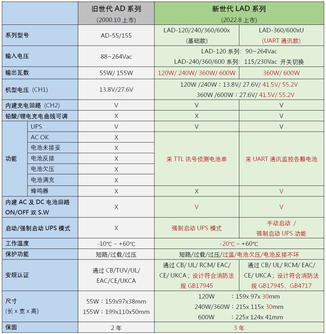 LAD系列采1U薄型機(jī)殼設(shè)計(jì),規(guī)劃有基礎(chǔ)款(LAD-120/ 240/ 360/ 600)及UART通訊款(LAD-360/600xU)兩種。此兩種版本共通規(guī)格特點(diǎn)有:主輸出(CH1)可供負(fù)載使用并內(nèi)建附屬輸出(CH2)可同時對電池充電、搭配電池可構(gòu)成UPS備援功能、CH1輸出電壓可調(diào) -20~+5%,可滿足不同電池種類及電壓微調(diào)需求、完整保護(hù)機(jī)制(短路/ 過載/ 過壓/ 過溫/ 電池欠壓/ 電池反接不壞)、通過CB/ UL/ CE/ UKCA/ EAC多國認(rèn)證并設(shè)計(jì)符合中國GB17945、GB4717(僅UART版本)消防法規(guī)…等,適用于安控、消防、緊急照明、警報(bào)、機(jī)房不斷電、門禁警報(bào)與中央監(jiān)控..等系統(tǒng)。