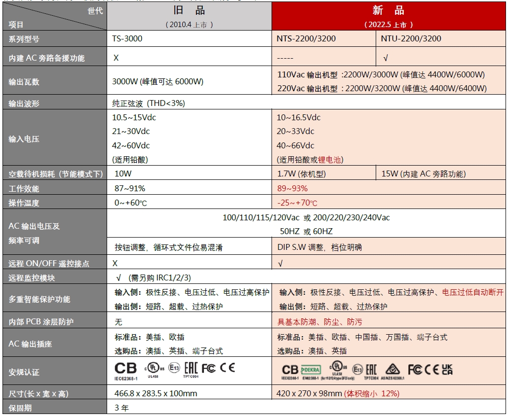 明緯繼2021.3起陸續(xù)上市NTS-250P/ 400P/ 300/ 450/ 750/ 1200/ 1700、NTU-1200/1700系列后,隨即新推出2200W/ 3200W更高瓦數(shù)獨立型DC-AC純正弦波逆變器NTS/ NTU-2200/ 3200系列,此四系列上市后全家族系列已有250~3200W相當(dāng)完整。相較于2010上市的舊世代TS-3000系列主要差異 : 尺寸較小、輸出功率提升了200W、性能優(yōu)化、操作接口更簡便、價格更具競爭力,為讓使用者快速了解新舊世代差異,詳請參考下表: